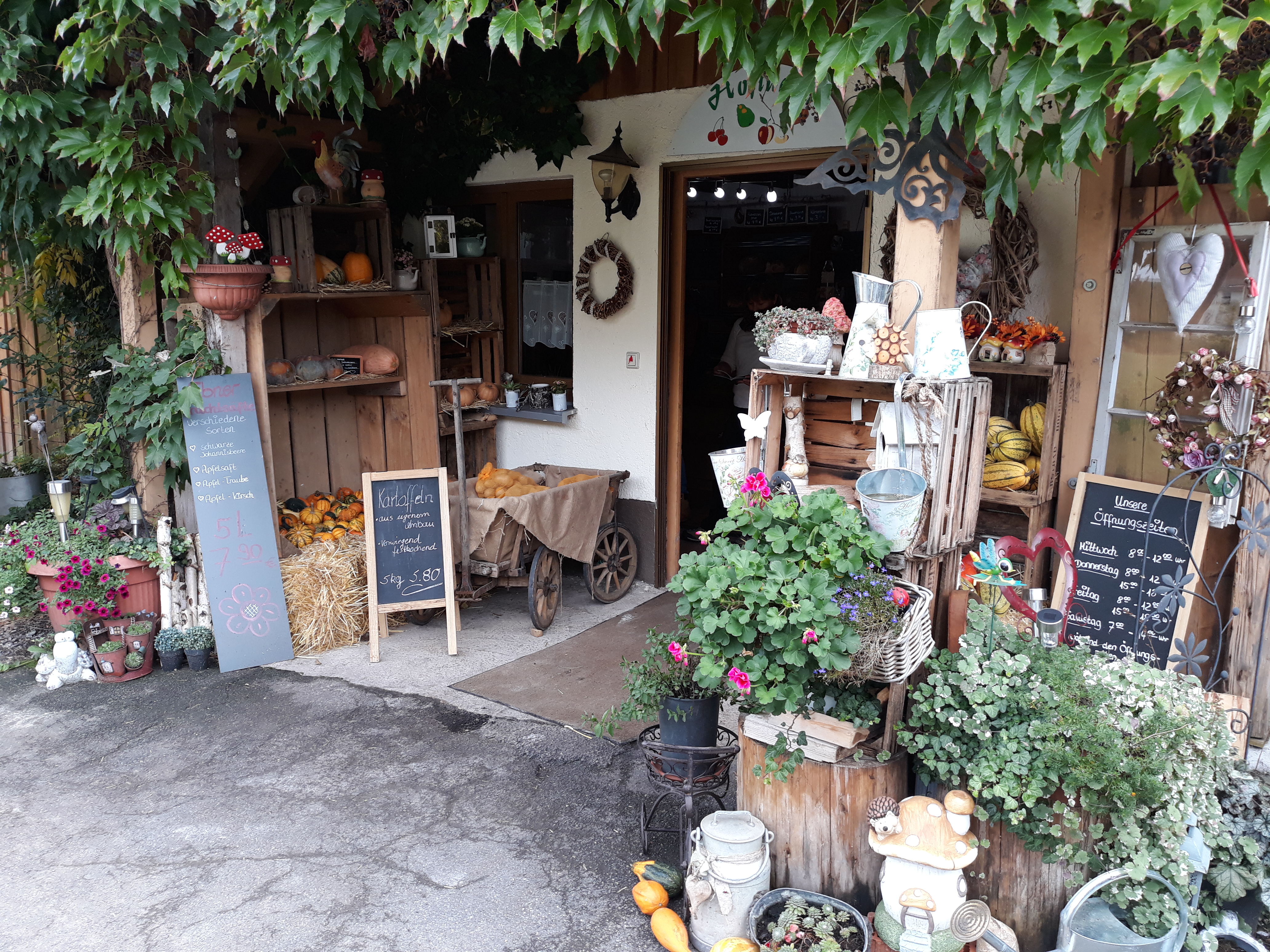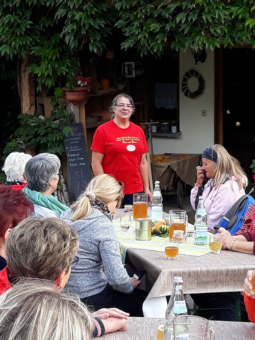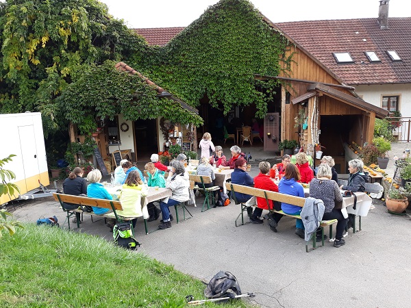 In Birndorf wurden sie beim liebevoll dekorierten Hofladen Thoma von der Inhaberin Elisabeth Thoma und ihrer Tochter mit Zwiebel- und Kürbisdünne bewirtet. Natürlich durfte auch der frische Apfelsaft nicht fehlen. Da es das Wetter mit den Frauen gut gemeint hatte, konnten sie während ihrer Rast draussen im Hof sitzen. |