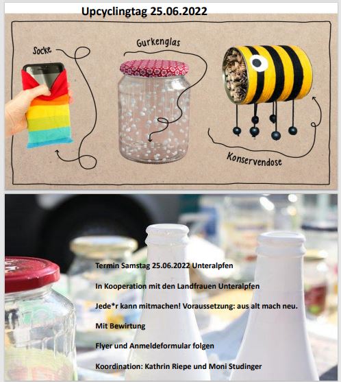 Bei der Vorstellung der kommenden Termine wurde insbesondere auf den Upcycling-Tag eingegangen, der unter dem Motto "aus Alt mach Neu" am 25. Juni 2022 in Unteralpfen stattfinden wird in Koordination mit den Landfrauen von Unteralpfen und an dem viele Landfrauen und Gäste erwartet werden.