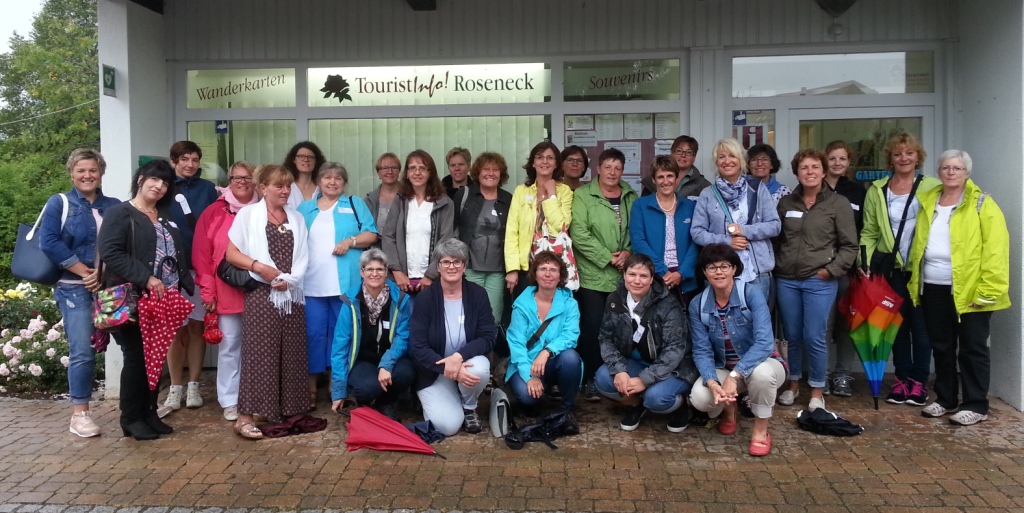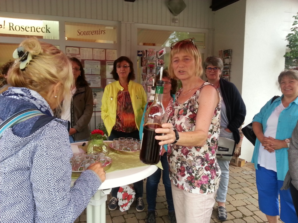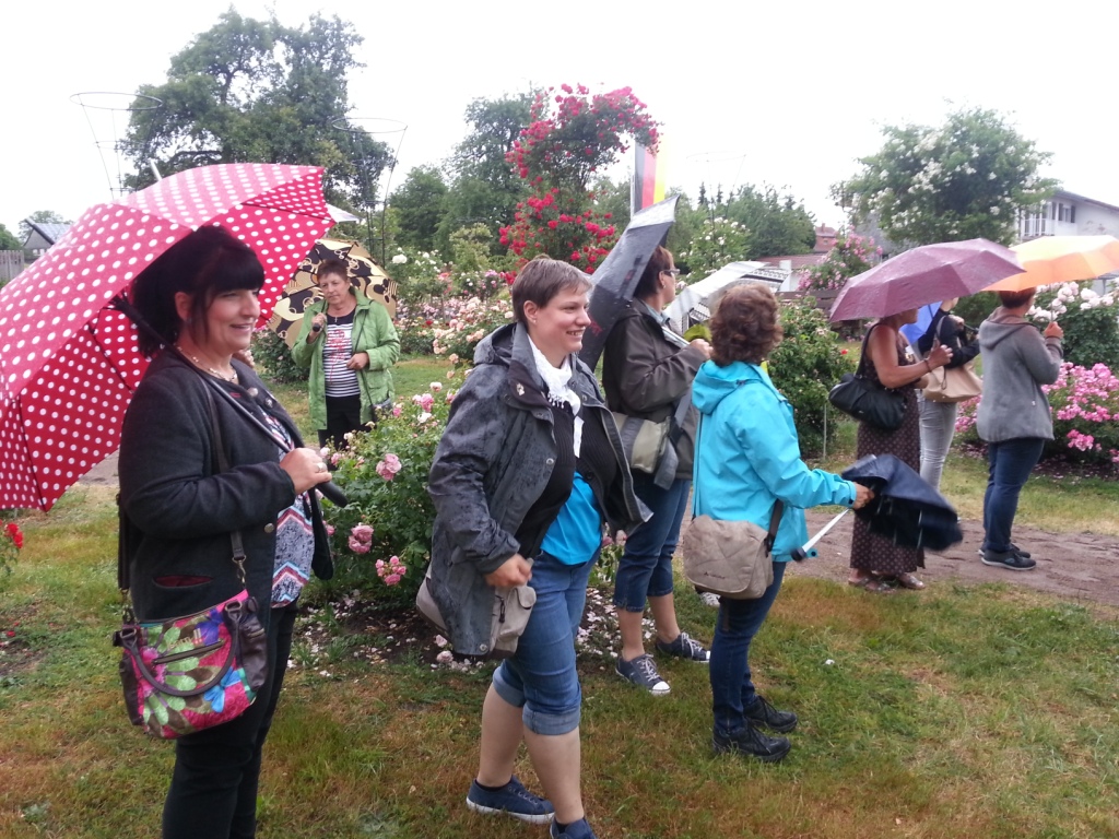 Pünktlich zum Start der Führung durch das Rosendorf fing es an zu regnen, was für die Frauen kein Problem war, zumal sie von Heidi Hilpert, Leiterin der Info-Stelle mit einem Rosenschnaps begrüsst wurden. Der Rosenexperte Erich Boll führte die Frauen durch tausende Rosenstöcke aller Grössen und Farben, oftmals wundervoll duftend. Er wusste viel Wissenswertes zu erzählen und gab gute Tipps für die Rosenpflege. |