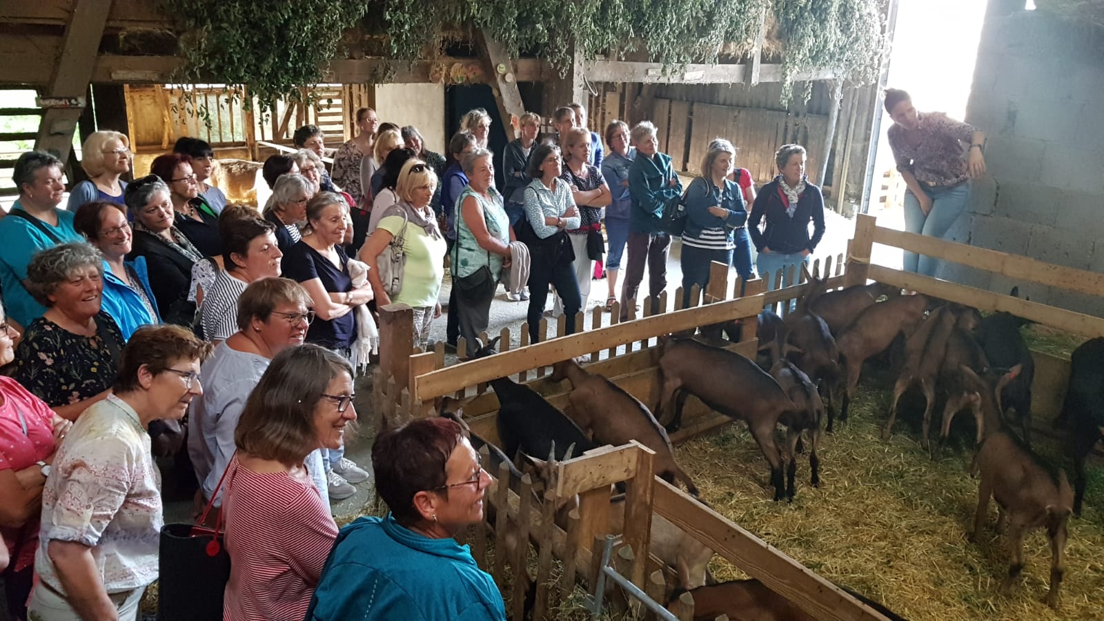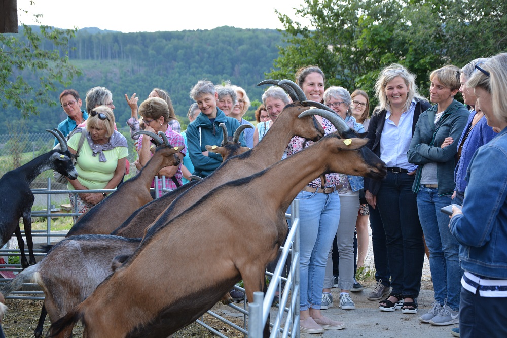 | Bei einer anschliessenden Führung wurden Ziegen, Kälber wie auch die Melkmaschinen für 76 Ziegen vorgestellt, die Bauer Florian gerade betätigte. Die Ziegenmilch wird an die Molkerei geliefert und kommt als leckerer Ziegenkäse wieder zurück, der in einem 24h-Automat in Wutöschingen angeboten wird. | |