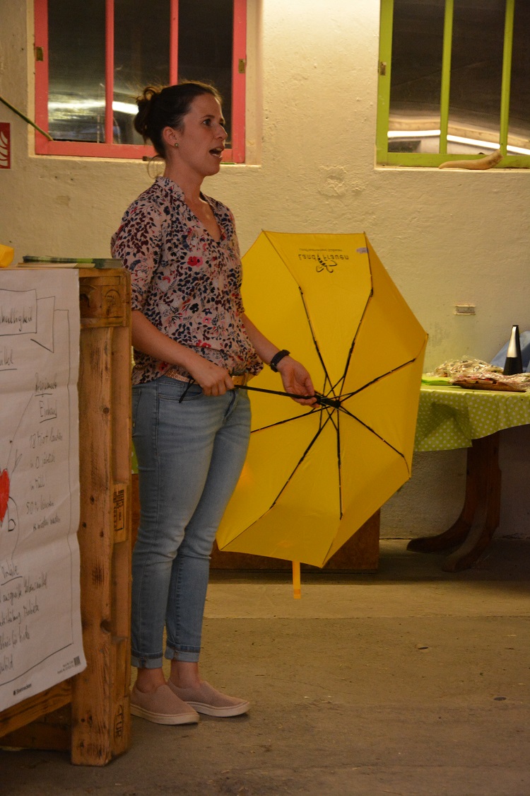 | Die sympathische Jung-Bäuerin des Lindenhofs, Christina Burkhard, hiess zusammen mit ihren 3 kleinen Kindern alle Gäste willkommen. Sie erklärte die heutige Struktur des Hofes und die nicht ganz einfache Umstellung auf einen Bio-Betrieb. |